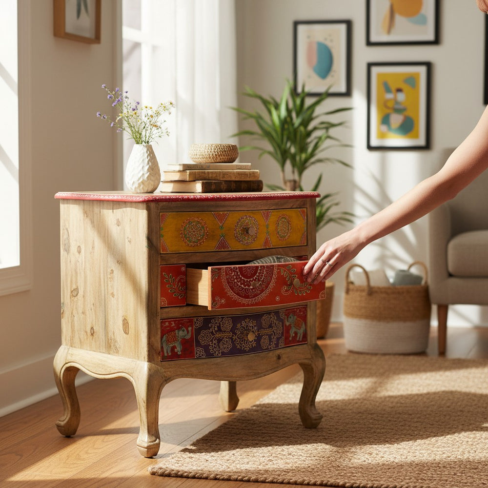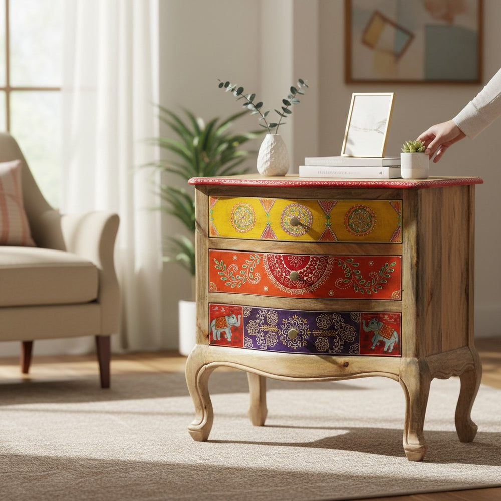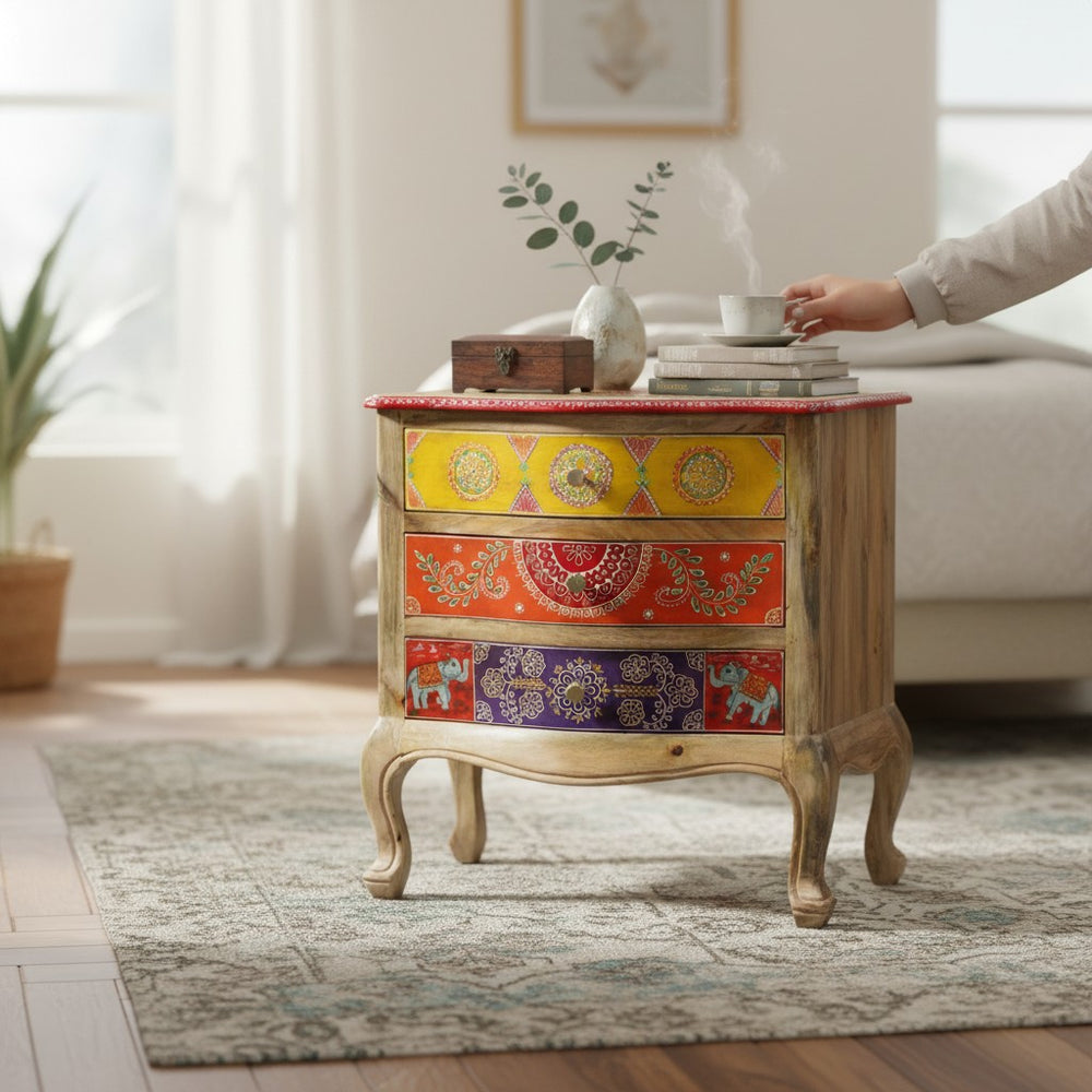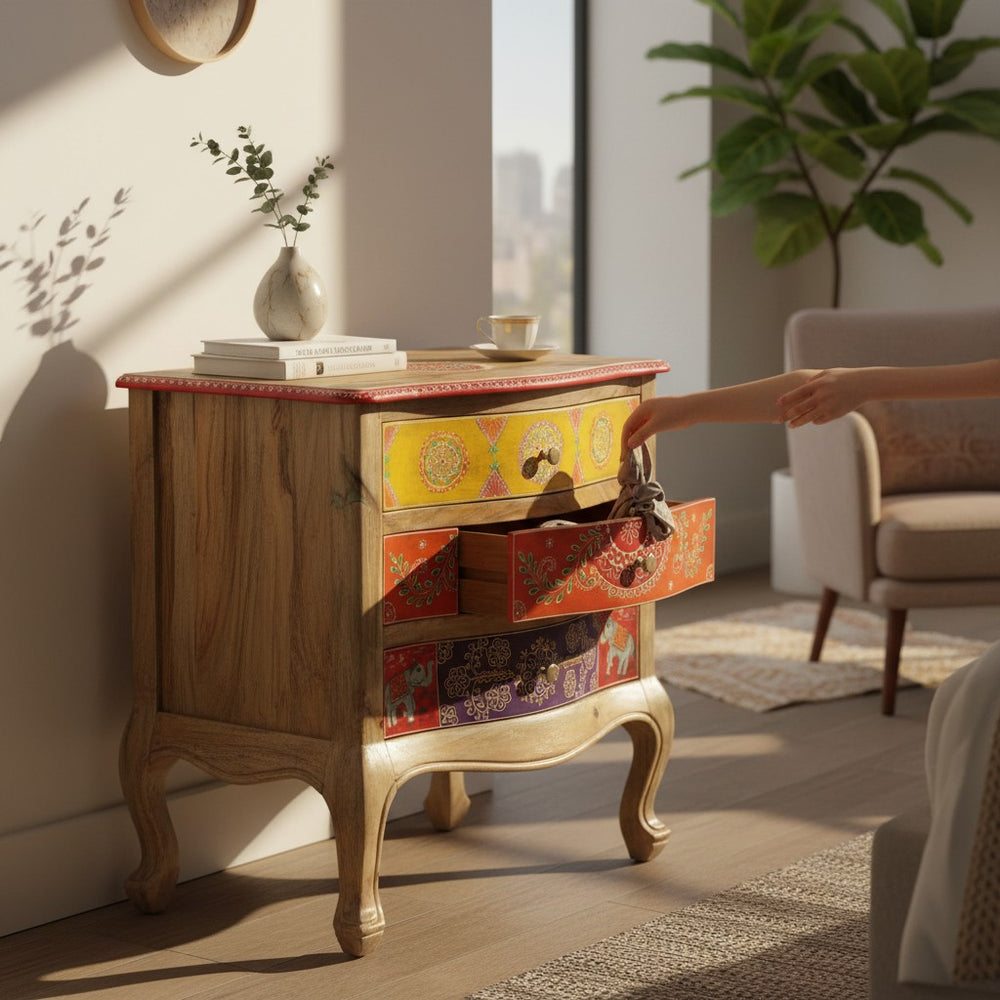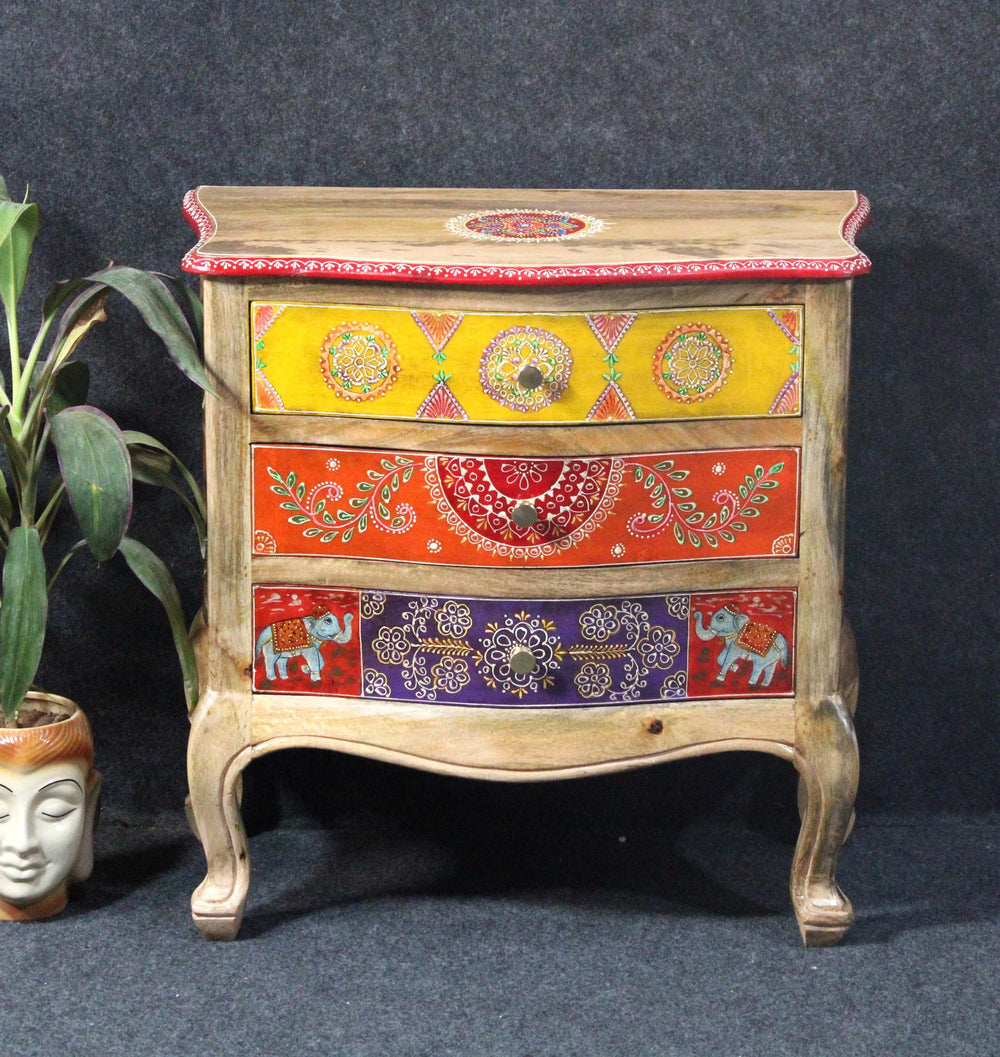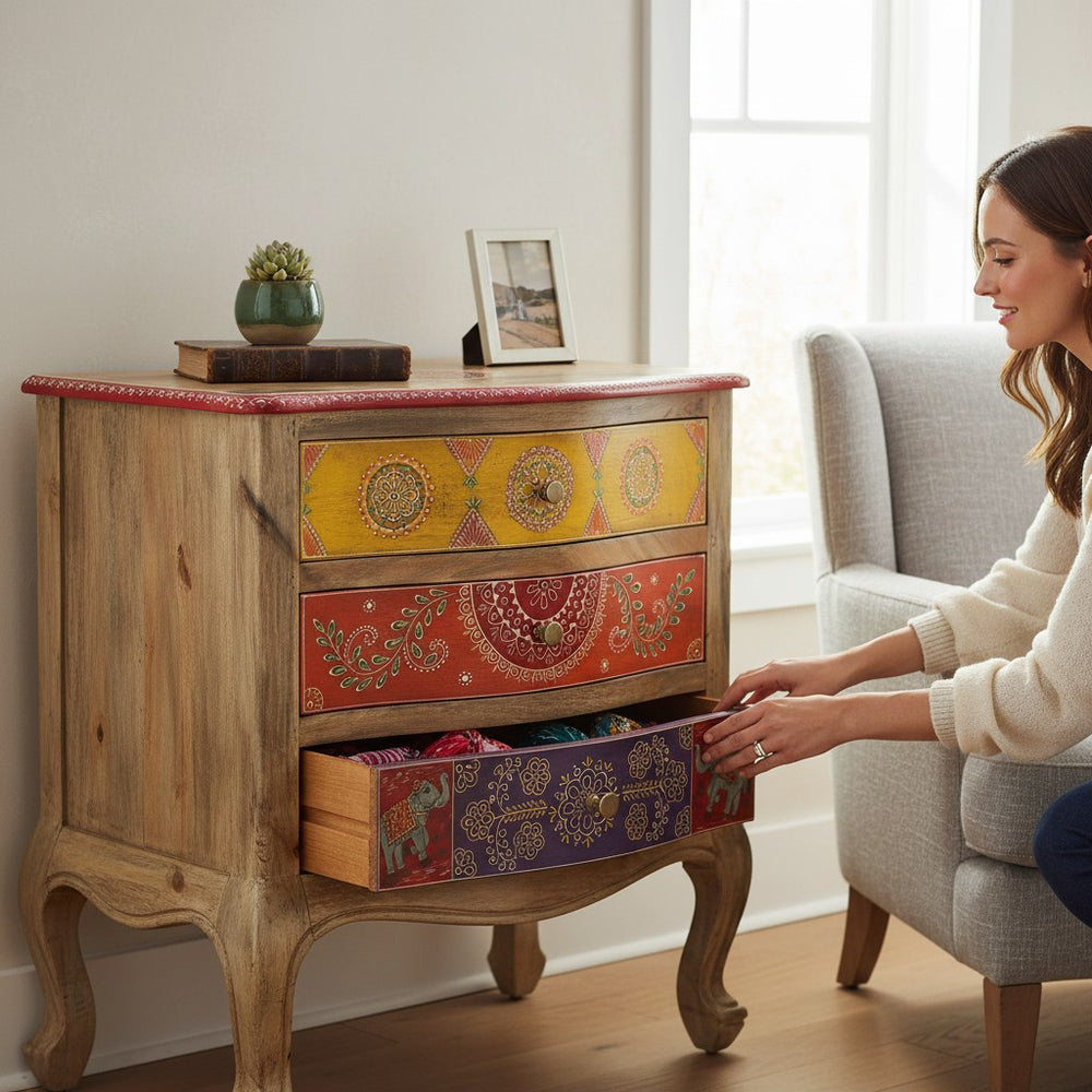 Brighten your bedroom with this colorful handcrafted chest of drawers, designed to add charm, culture, and practicality to your living space. Featuring beautifully hand-painted Rajasthani motifs in warm yellow, orange, and purple tones, this chest brings a joyful, artistic touch to any room. Perfect for storing clothes, accessories, or bedside essentials, it serves as both a functional storage unit and a stunning décor statement that elevates any modern or traditional home.