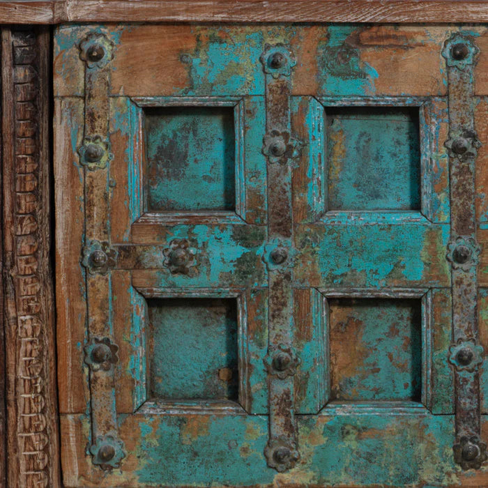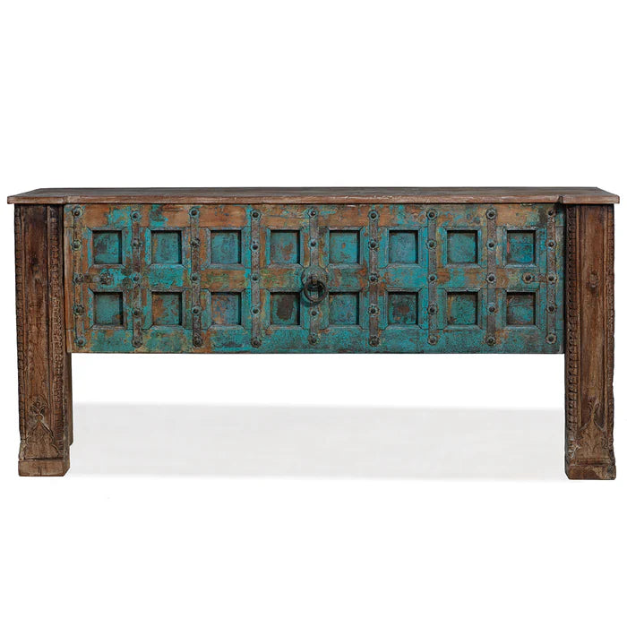 The panelled, front section of this unusual console is old, once forming part of old door panels in India. It still retains the original blue painted finish, now worn to show the more natural wood colour in parts, and with the old iron ring handle still fitted centrally. The heavy, carved front legs are also old, with these vintage sections now blended with a mango wood top and rear legs to create this wonderful console. The front section is further decorated with iron strips secured with floral studs that add to the unique character of the table.