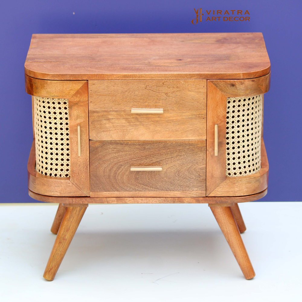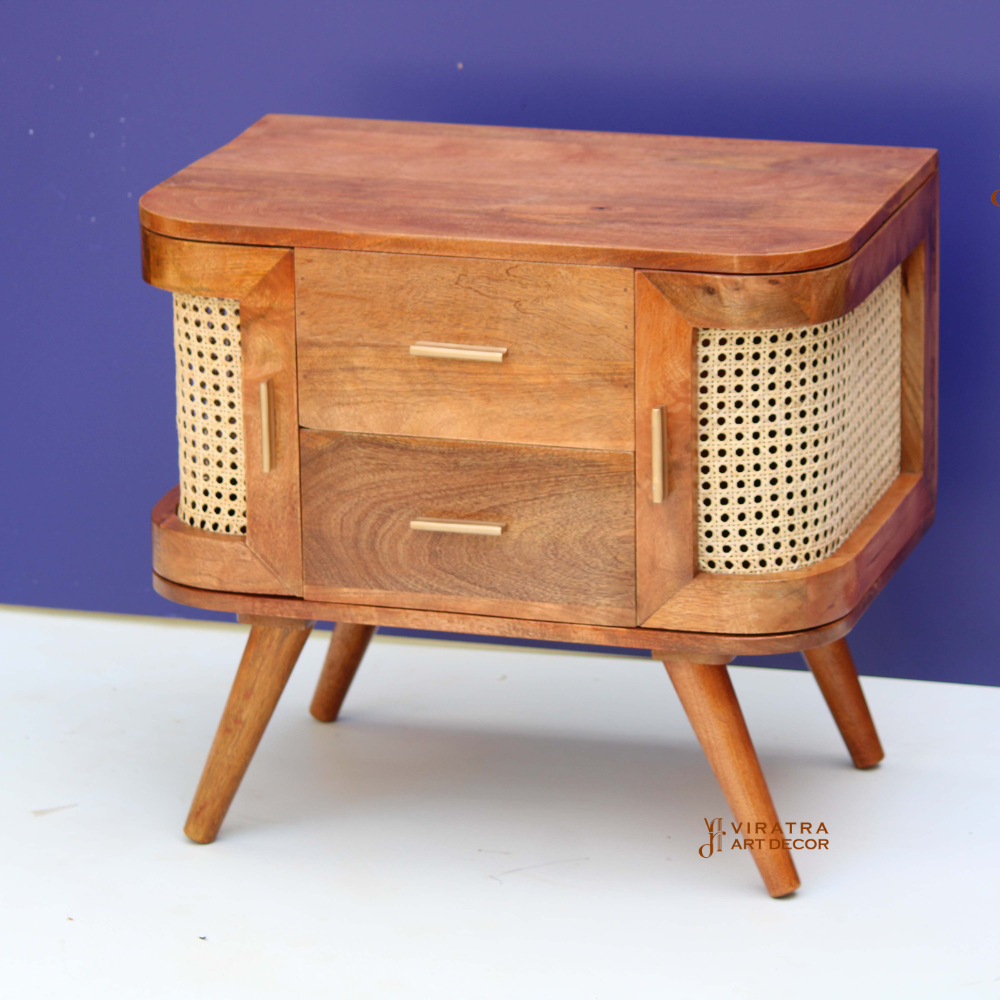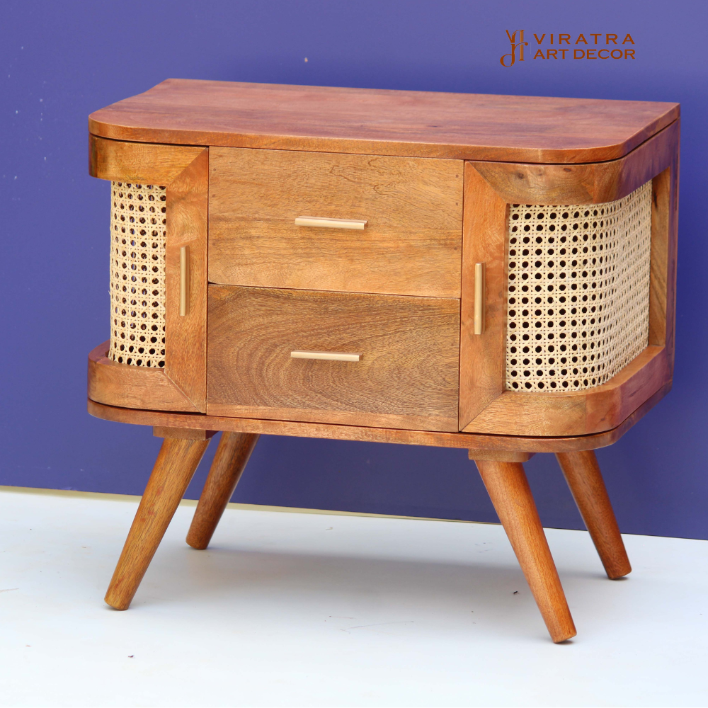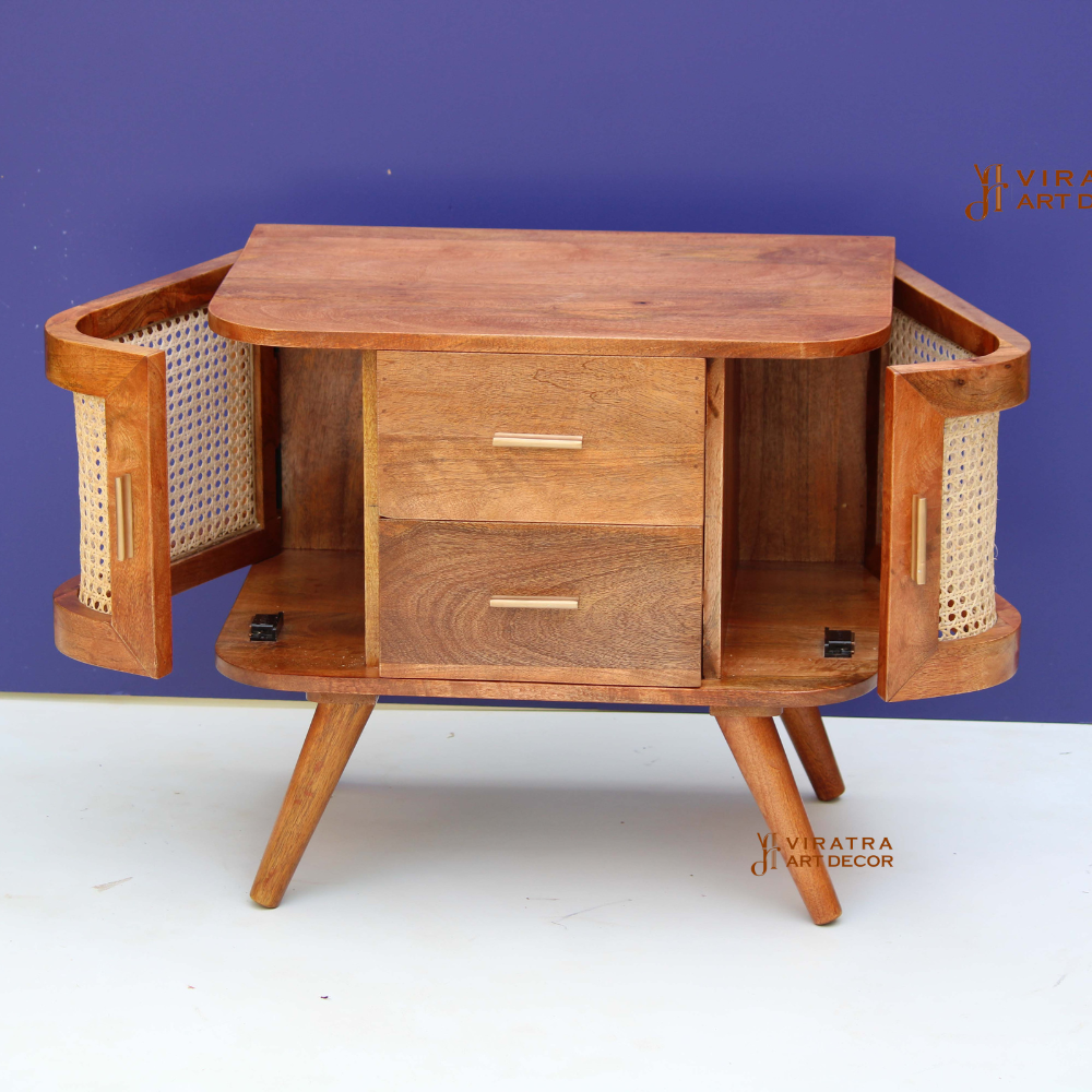 solid Indian mango wood and woven rattan panels. Featuring two drawers and two small cabinet doors, this piece offers functional storage in a compact, stylish design. The folding wooden legs add a distinctive touch, making it easy to transport or store when needed.