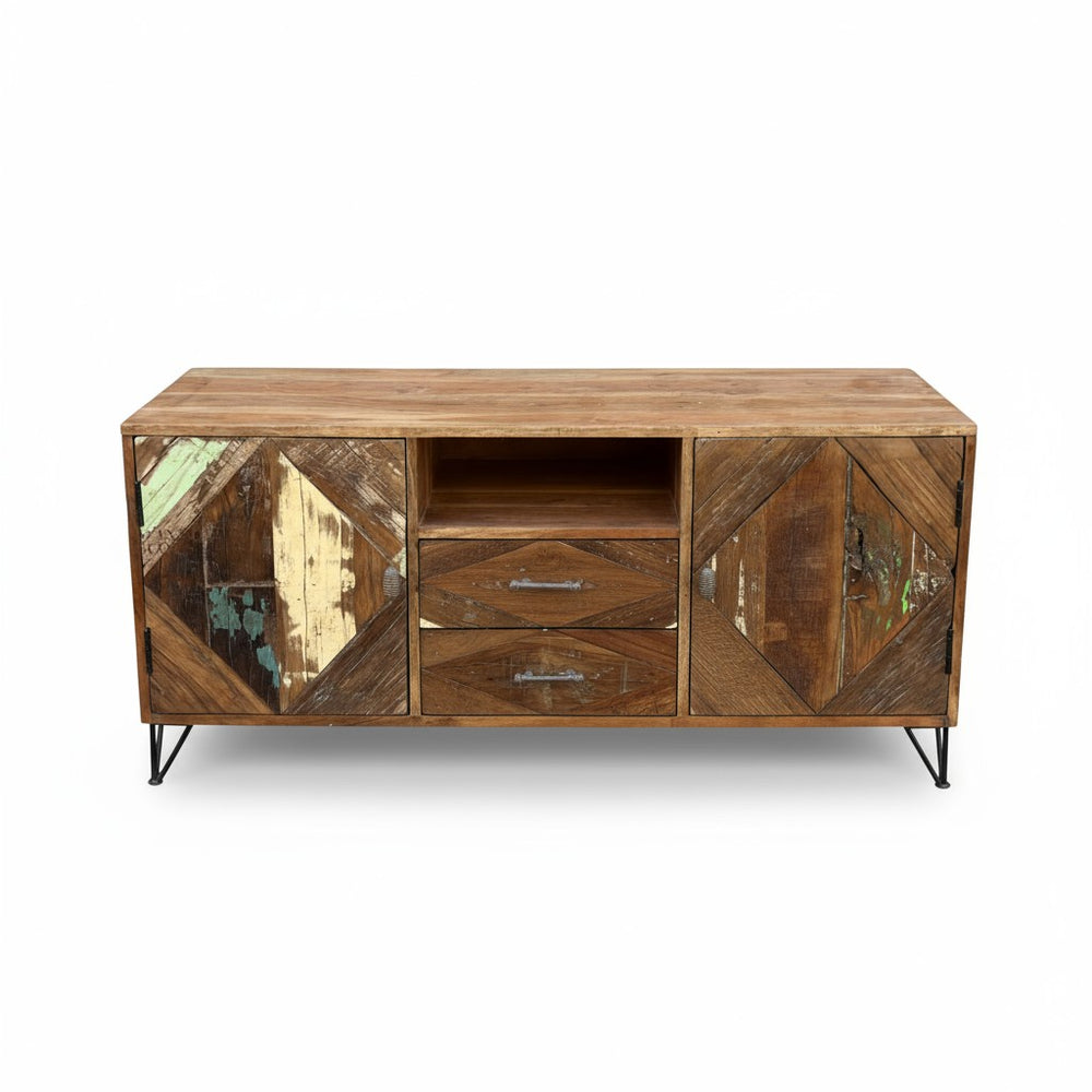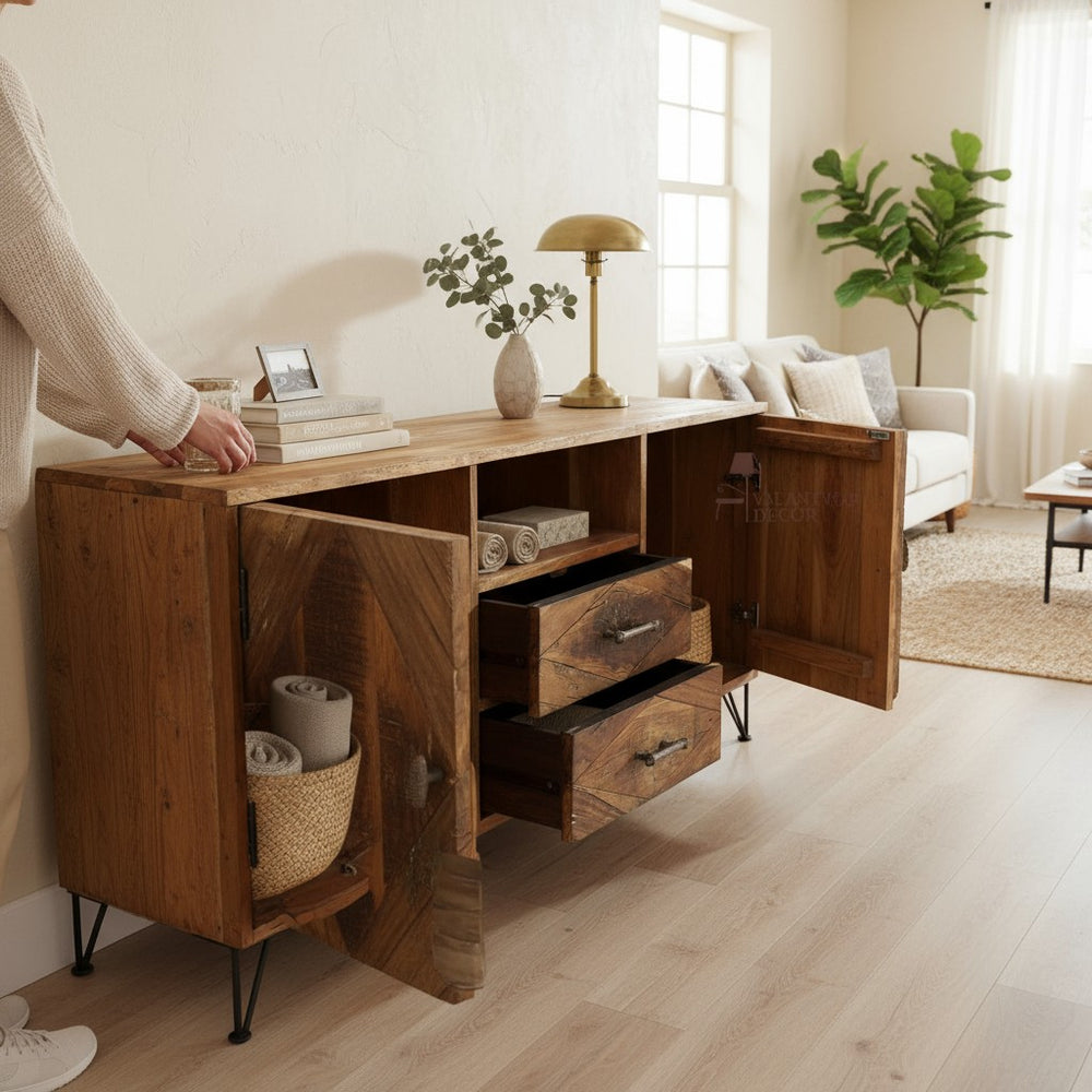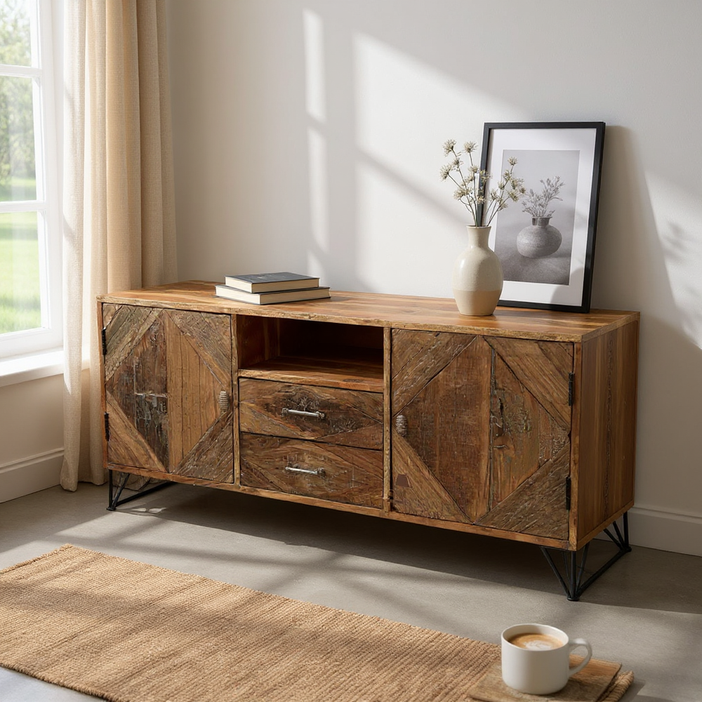 The reclaimed wood finish delivers a warm, organic ambiance, while the geometric door panels and open shelving create a stylish yet useful layout for everyday living. Whether used as a media console, buffet table, or storage cabinet, it enhances your space with a blend of eco-conscious craftsmanship and timeless design.