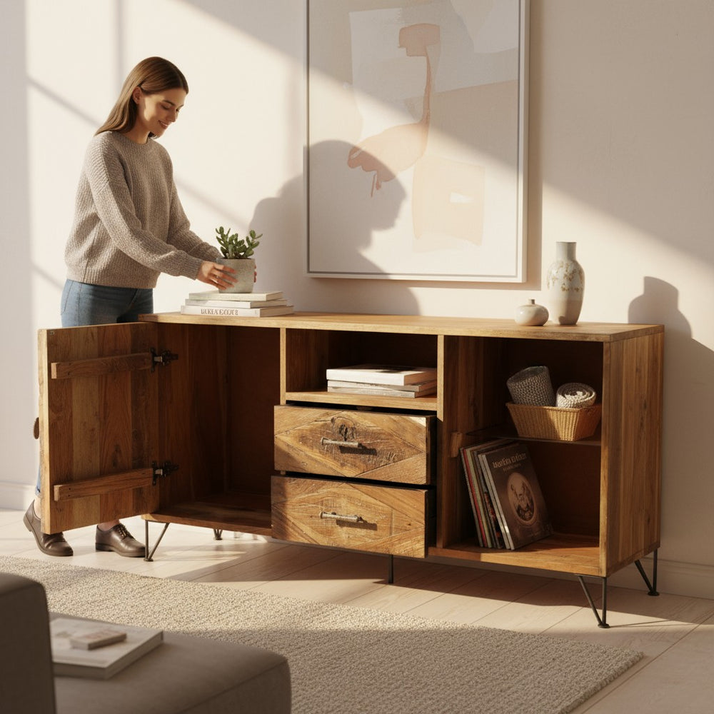 Includes two spacious drawers, two side cabinets, and open shelving, ideal for media devices, linens, books, or decorative pieces.