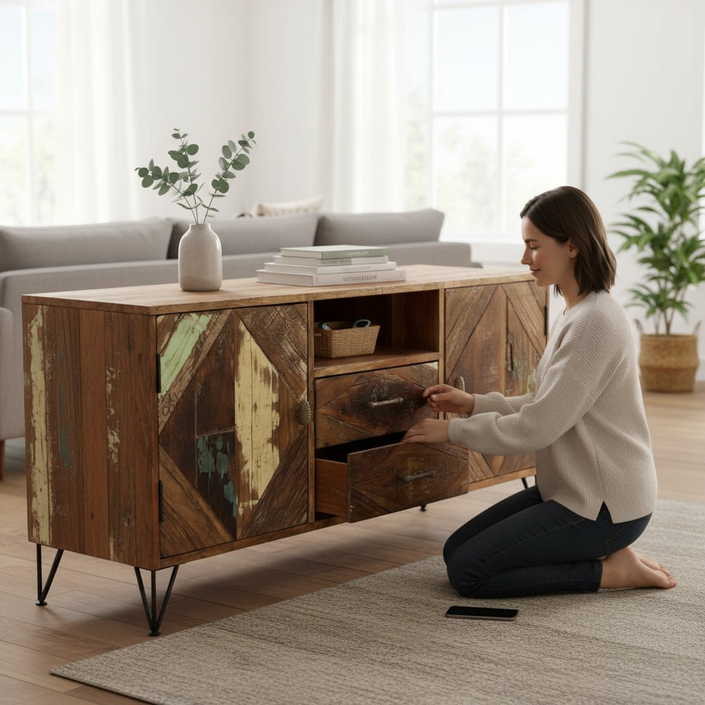 Bring earthy charm and modern function into your home with this beautifully crafted Rustic Reclaimed Wood Drawer Sideboard. Designed for warm, contemporary lifestyles, this piece blends raw natural textures with subtle industrial detailing. Perfect for living rooms, dining spaces, hallways, or entryways, it becomes an instant statement piece—adding character while offering practical storage.