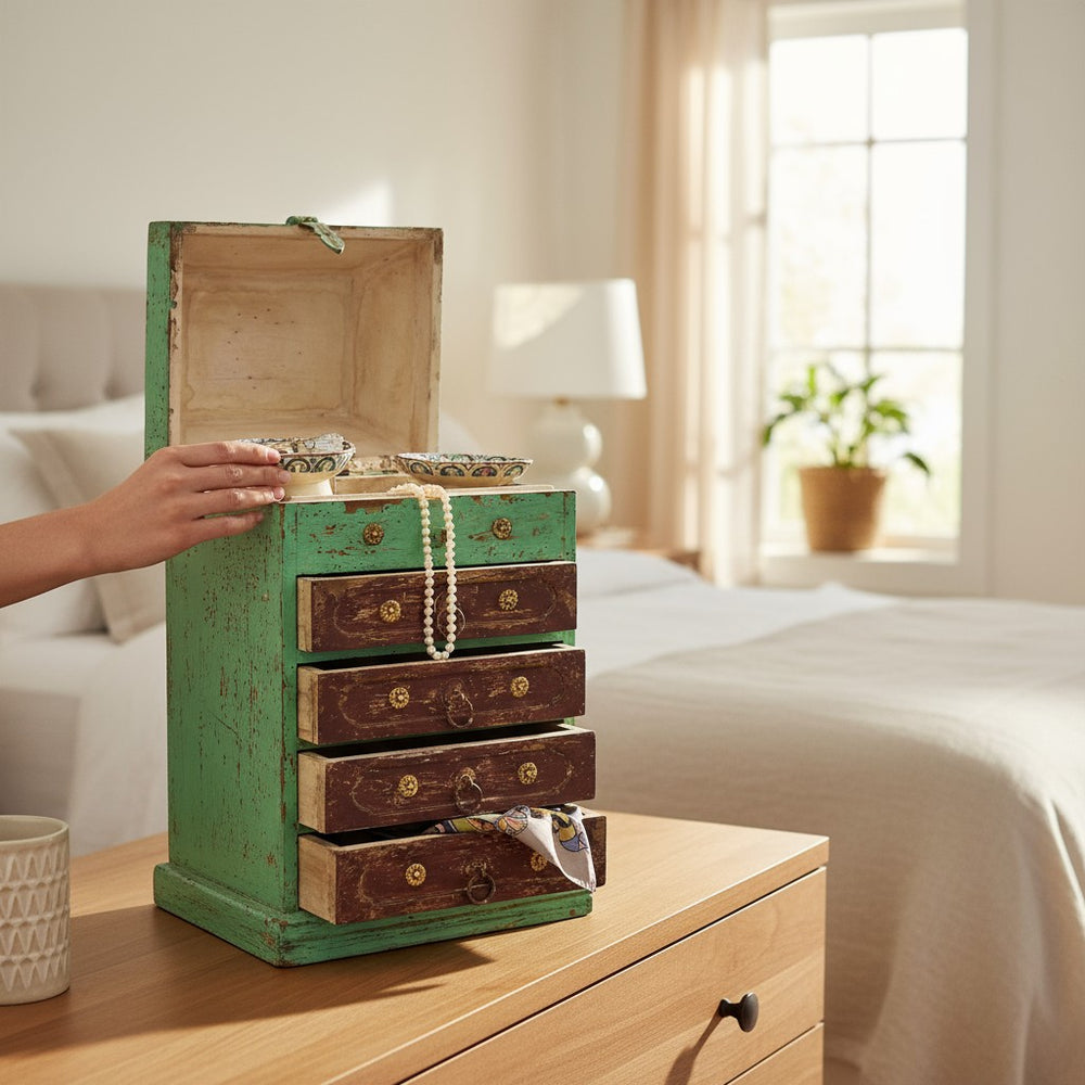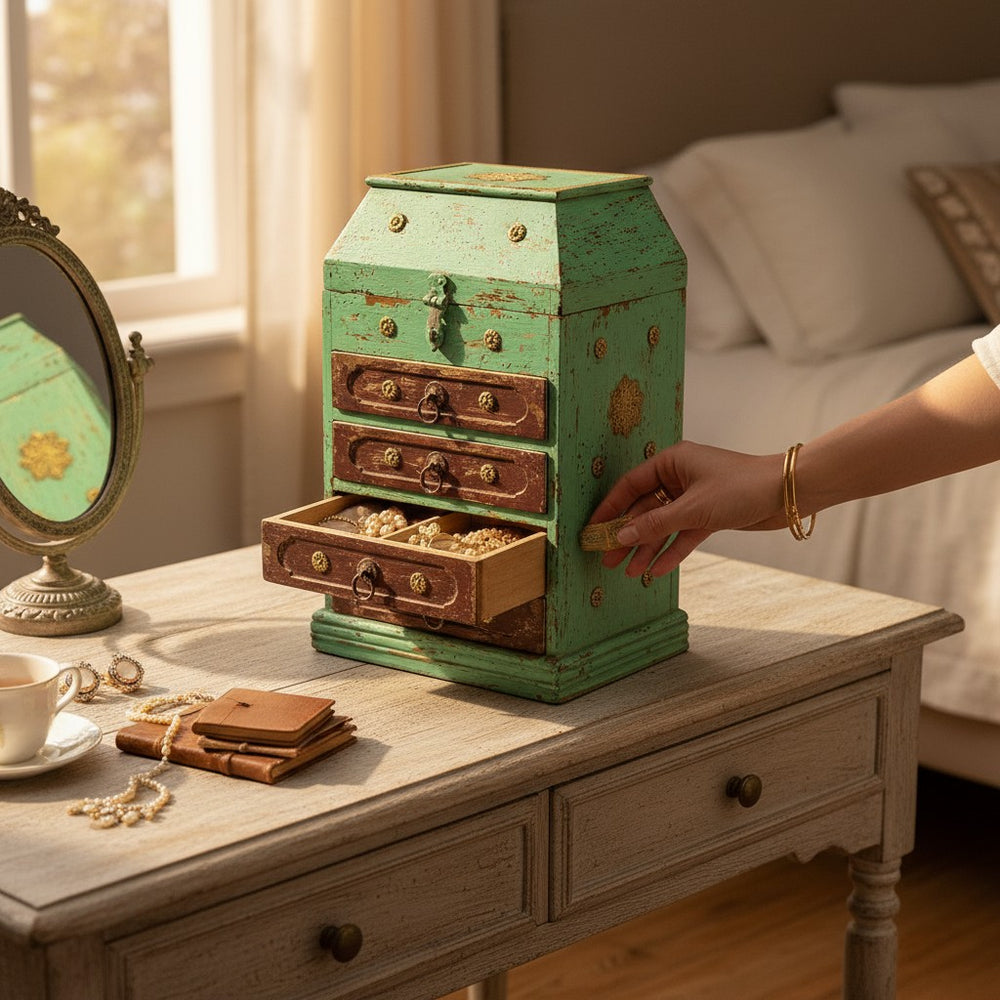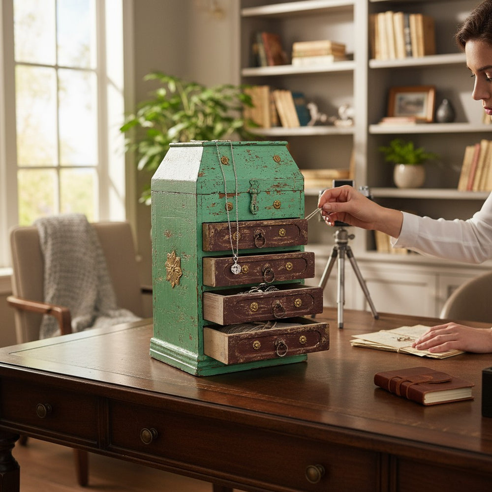 Perfect for bedrooms, vanity corners, boutique displays, and photography styling, this jewelry organizer blends functionality with old-world charm. The multiple drawers offer ample space for necklaces, rings, bracelets, watches, and keepsakes, allowing you to keep your essentials beautifully arranged.