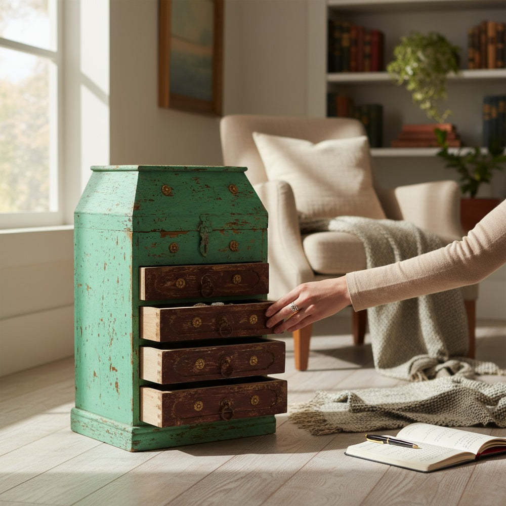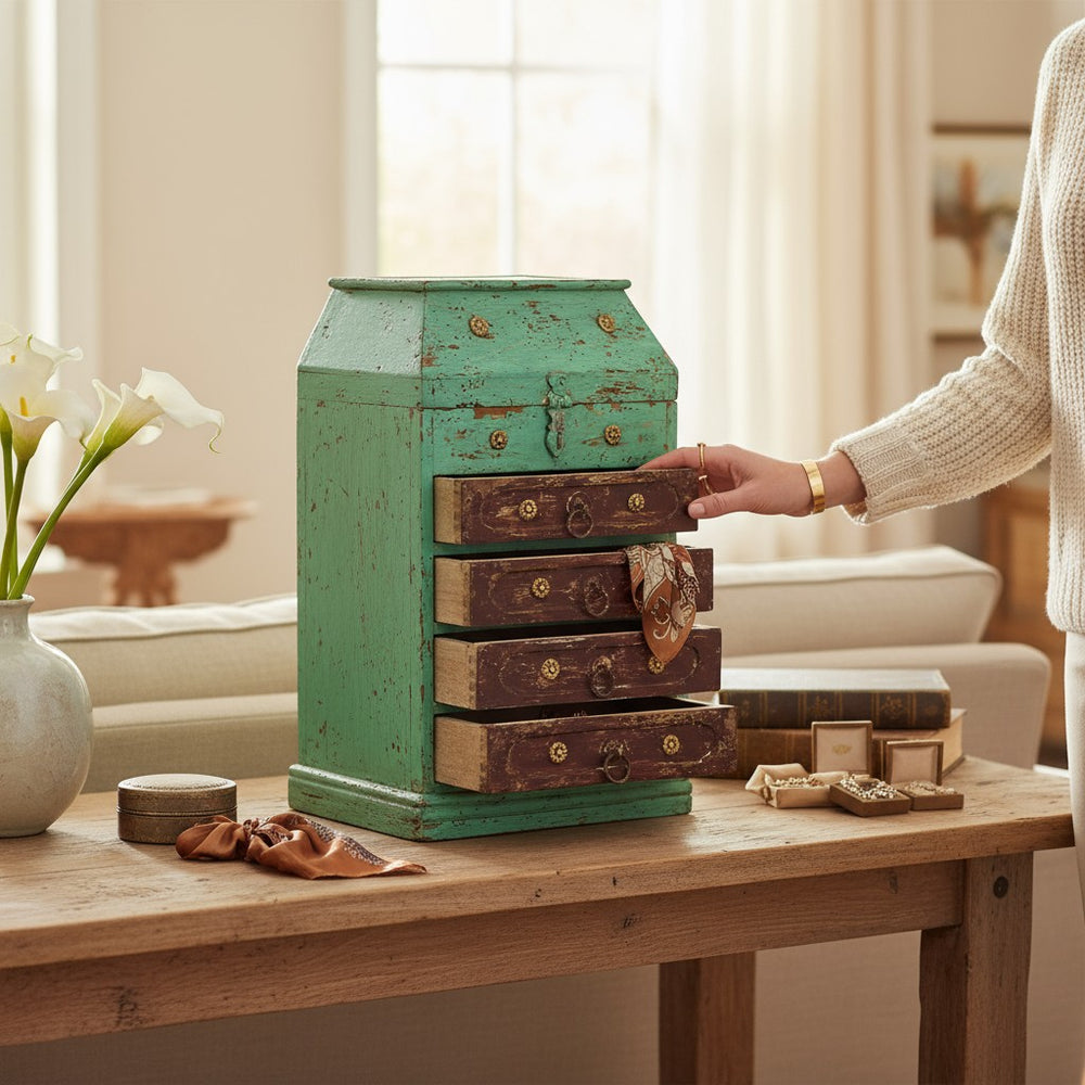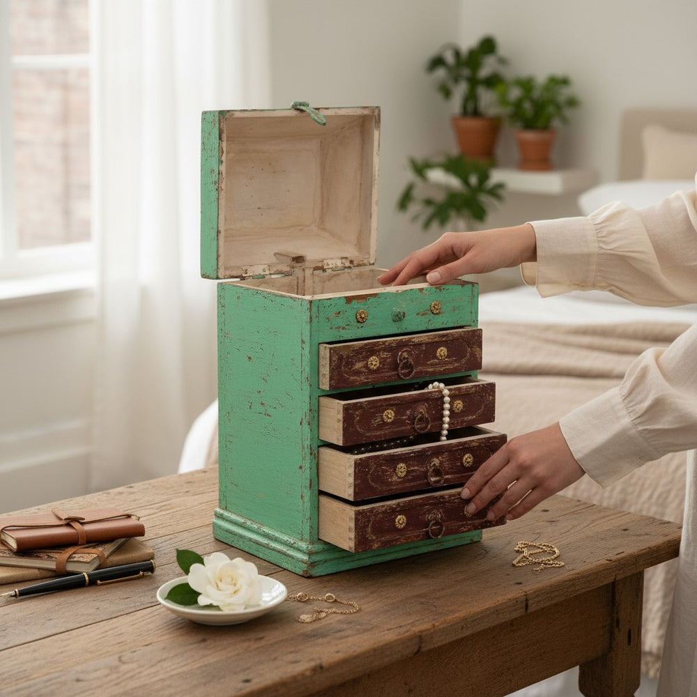 Elevate your dressing space with this charming vintage-style wooden jewelry chest, designed for those who adore curated, meaningful décor. Its distressed turquoise finish and antique brown drawers create an authentic rustic appeal, making it a standout piece in modern, bohemian, farmhouse, and eclectic interiors.