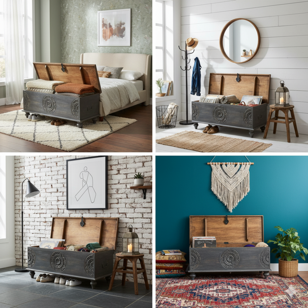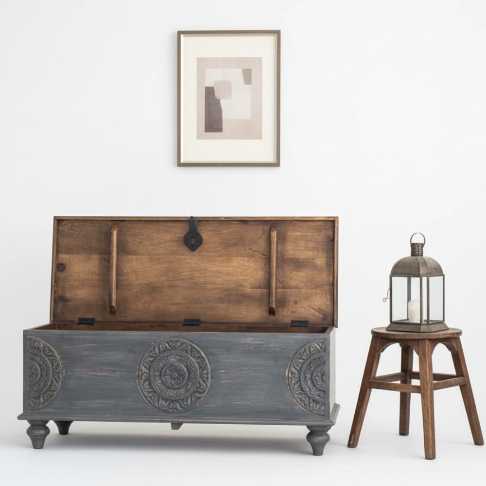 Ideal as a living room coffee table, bedroom storage bench, or entryway accent trunk, this versatile design blends Indian artistry with contemporary elegance.