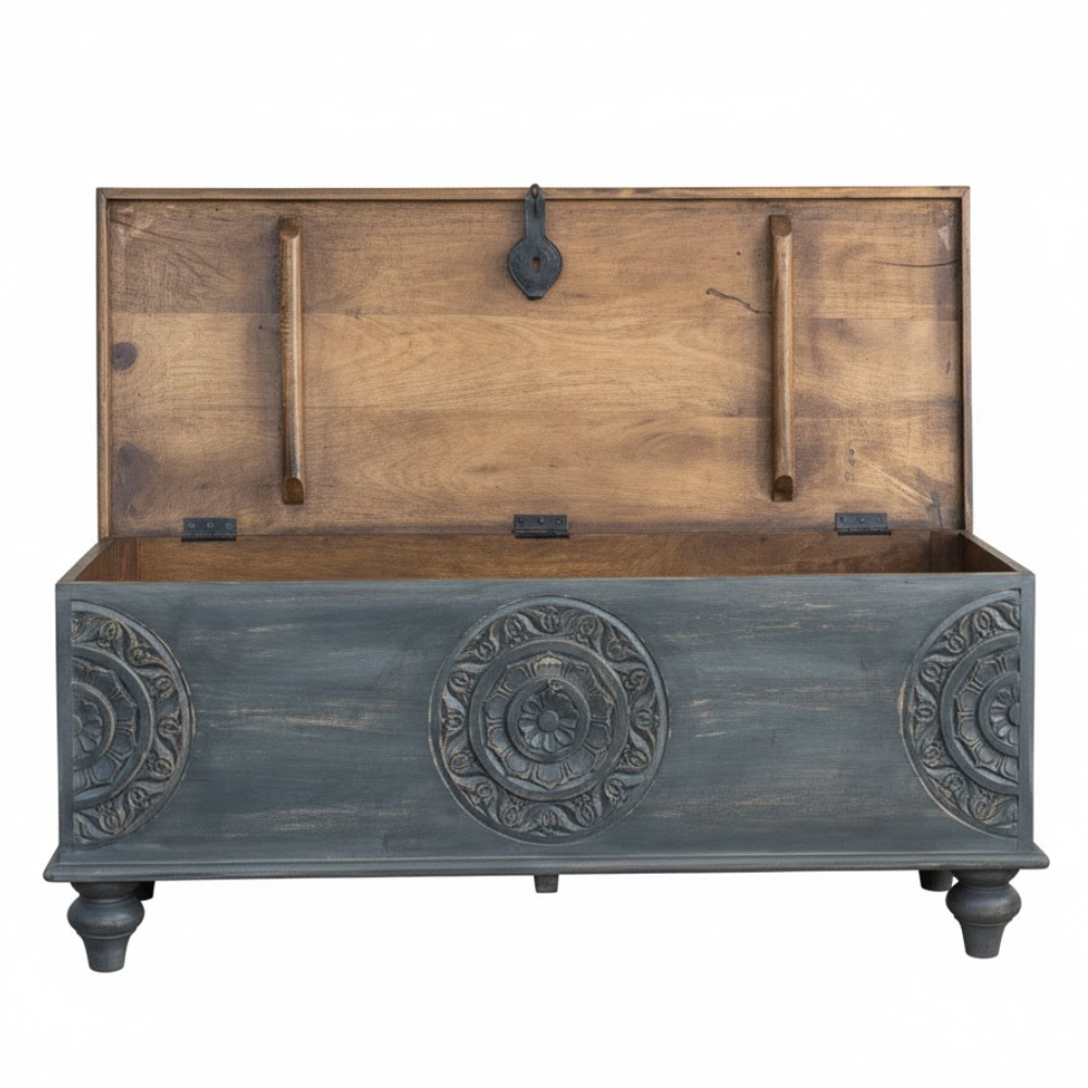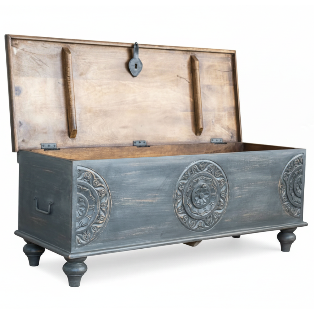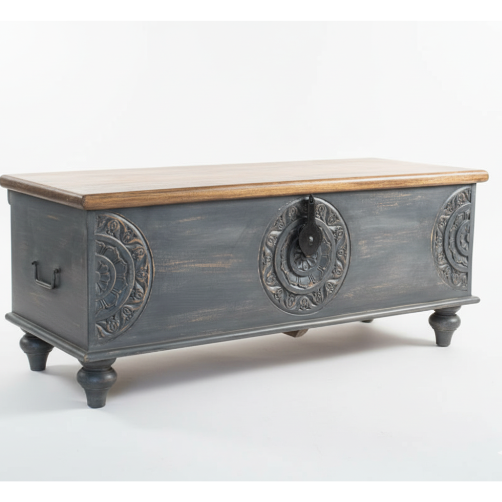 Add timeless charm and practical storage to your home with this hand-carved Indian wooden blanket chest. Crafted from solid mango wood, this exquisite piece features intricate floral medallion carvings across the front panel, finished in a distressed matte black tone that beautifully highlights its traditional detailing.