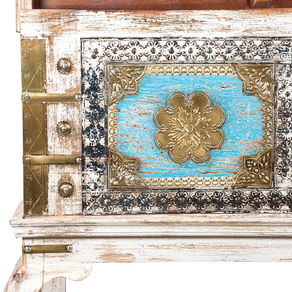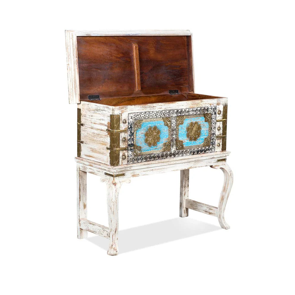 Accentuate the foyer and entryway of your home with the antique look AARON CONSOLE TABLE. Constructed using solid mango wood, the console table comes with lift-top storage that has brass inlays. The cabriole legs on the front and the white distressed look ooze out transitional elegant style. The tabletop can be used to decorate with potted succulents to welcome guests. Place it behind a sofa against a wall in the living room and adorn it with souvenirs and photo frames. The front of the console table is designed with riveted iron bands and brackets and has a cool blue shade that contrasts the off-white base.