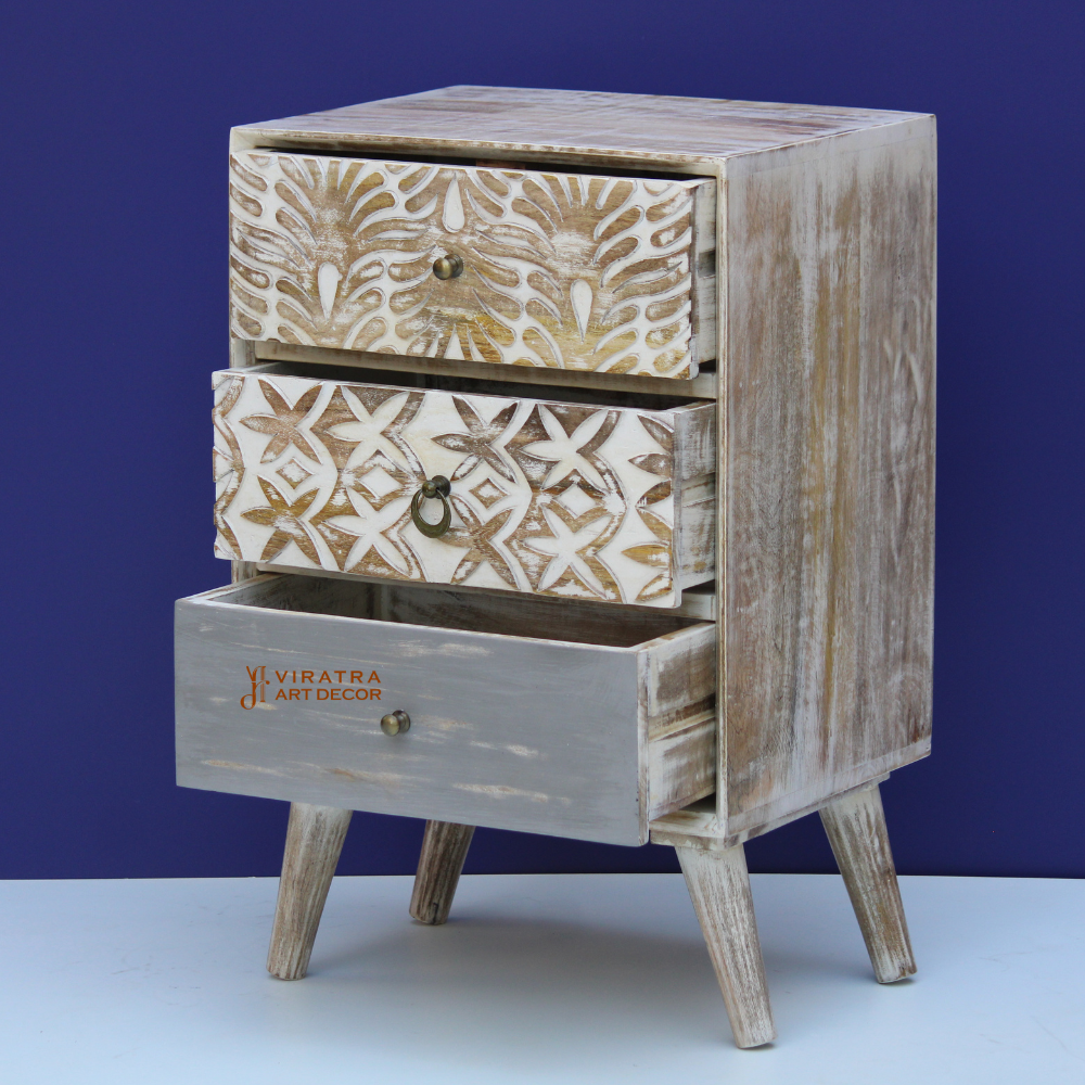 White Carved 3 Drawer Chest. Made from solid mango wood, this elegant piece features intricate hand-carved detailing across the drawer fronts, finished in a soft, whitewashed tone that highlights the natural wood grain.