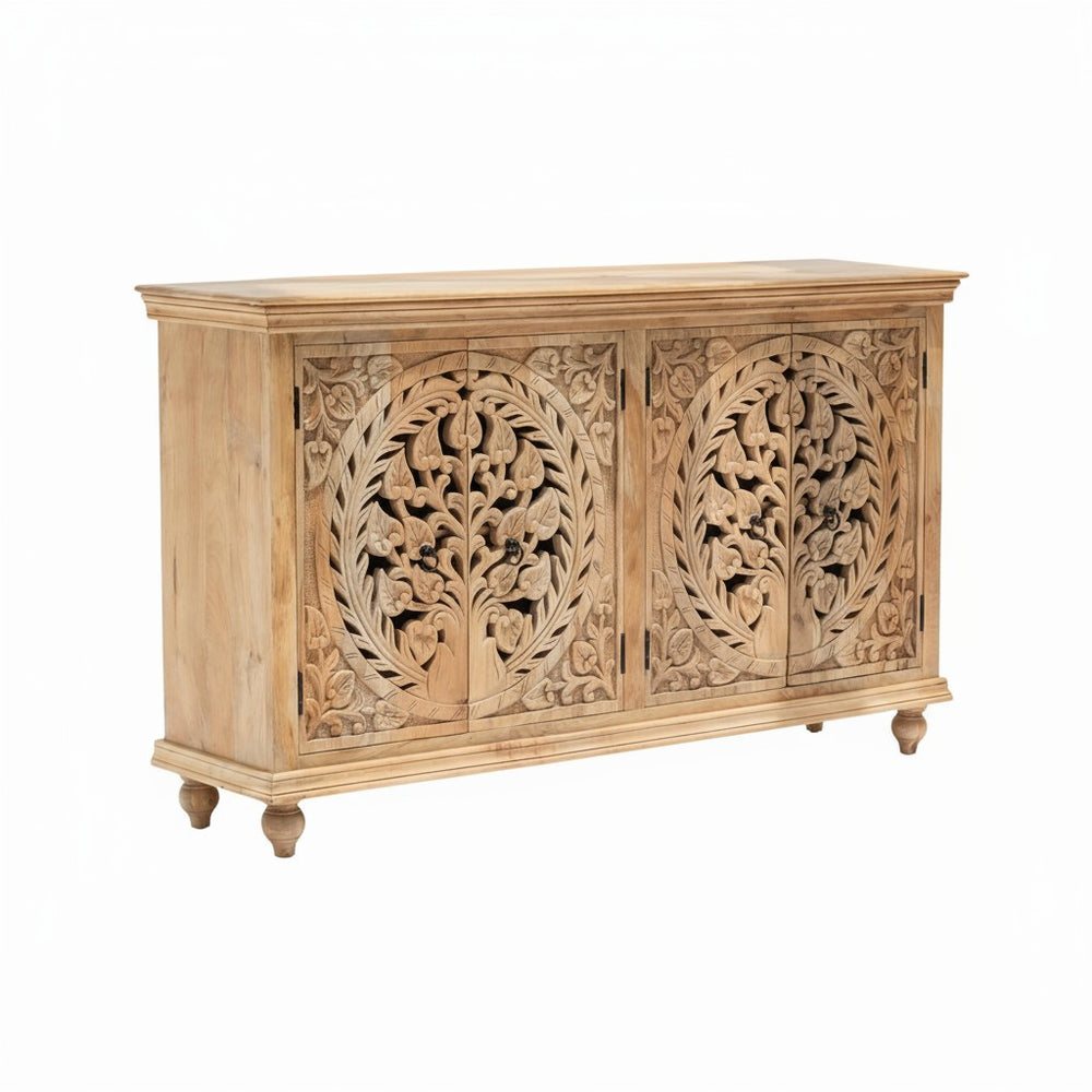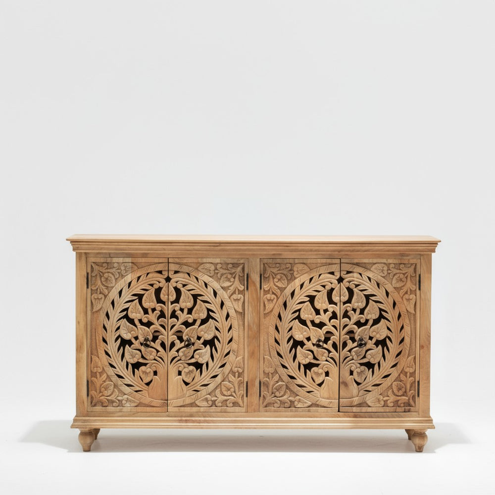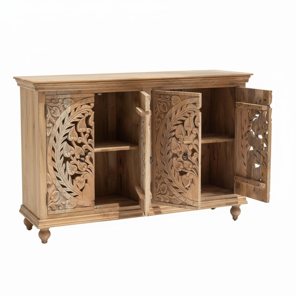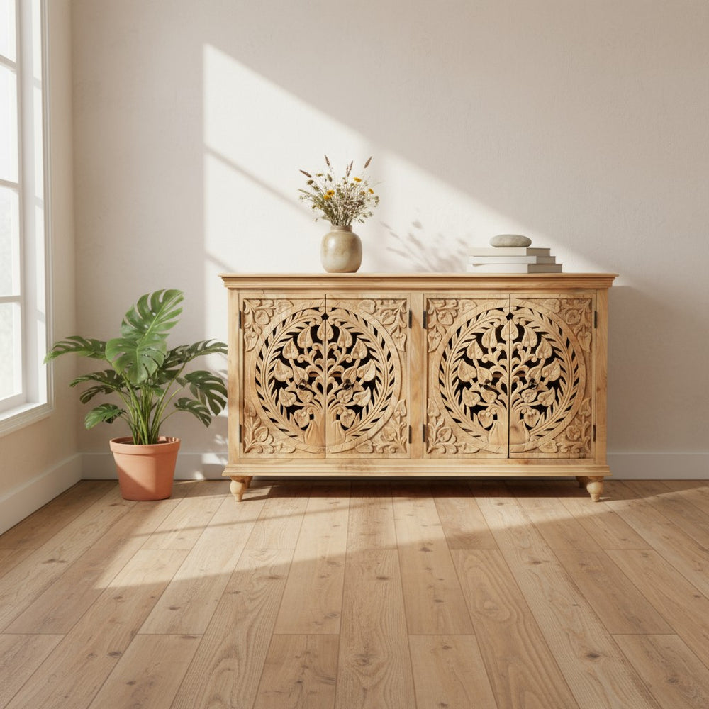 Add elegance and craftsmanship to your home with this Hand-Carved Wooden Sideboard by Viratra Art Decor. Expertly made from solid wood, this piece features intricate double-panel floral carvings inspired by traditional Indian design. Combining natural beauty with functional storage, it serves as a stunning centerpiece for your living or dining space.